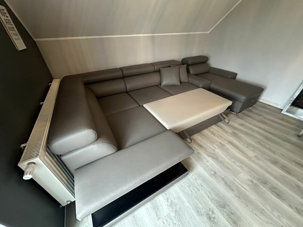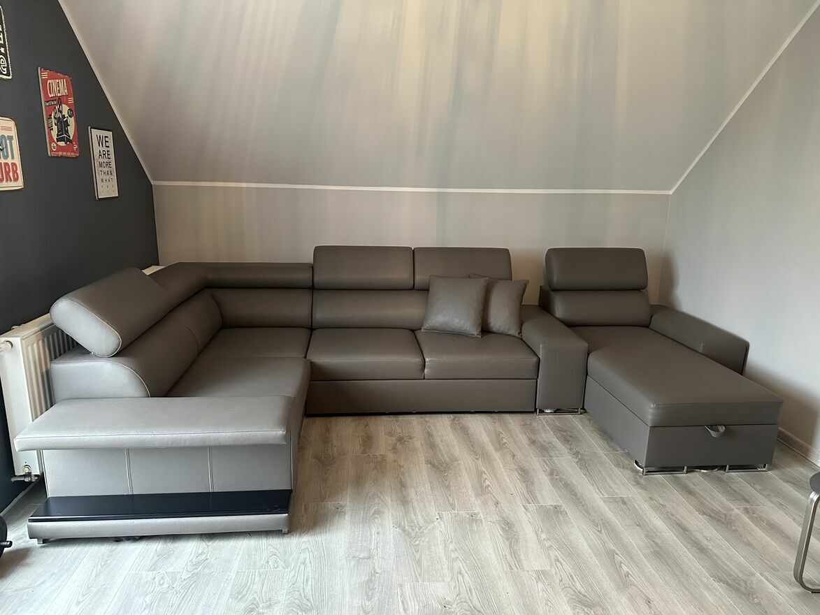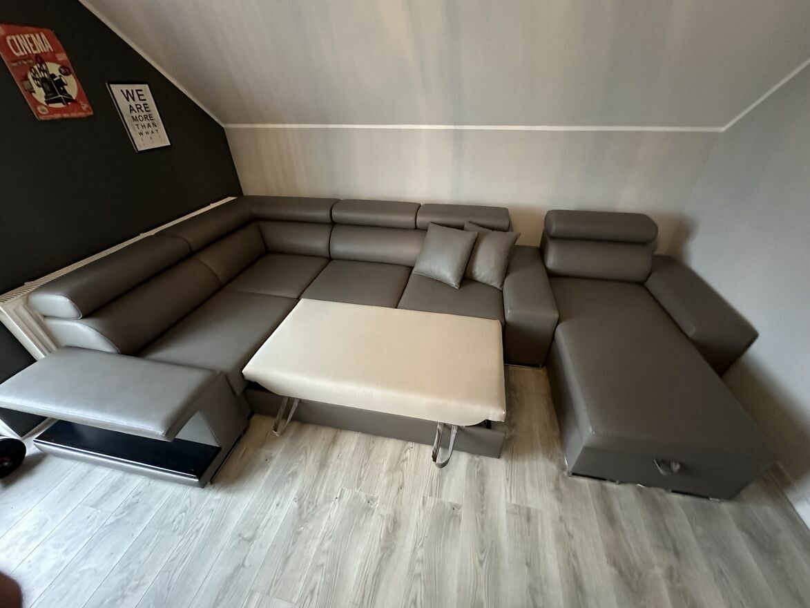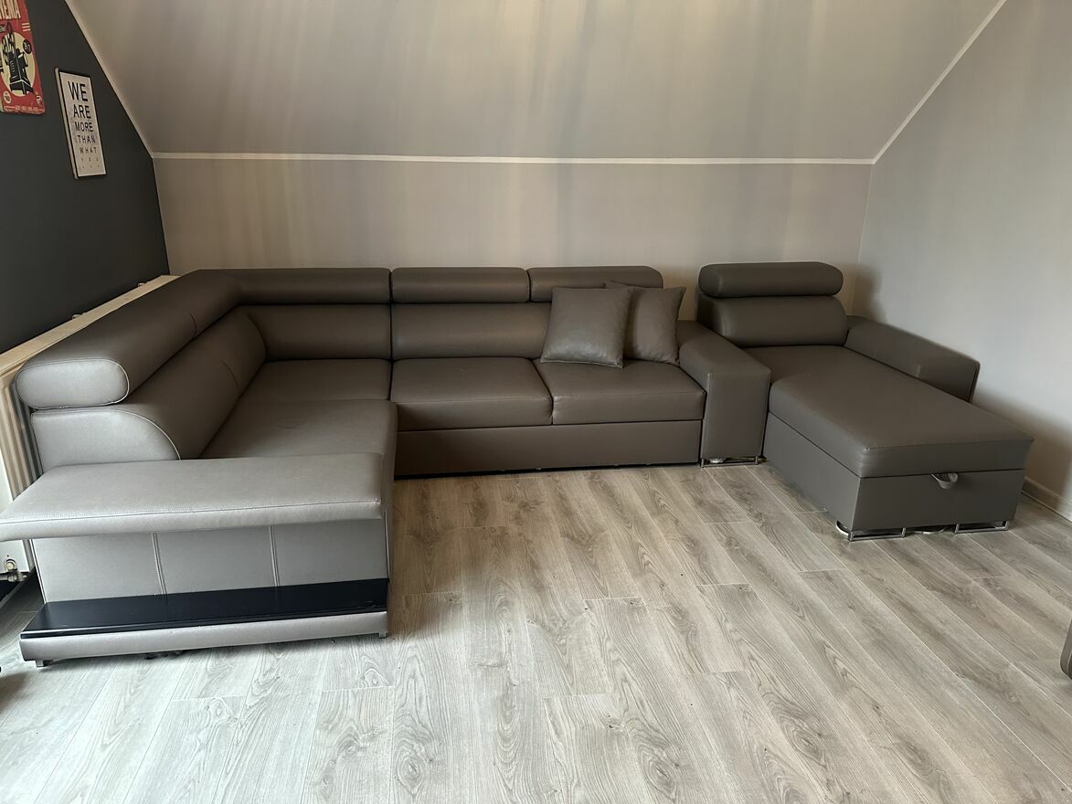 SPRZEDAM ELEGANCKI NAROŻNIK U – JAK NOWY, STAN IDEALNYNa sprzedaż nowoczesny, bardzo wygodny narożnik w kształcie litery U, wykonany z wysokiej jakości ekoskóry w eleganckim, uniwersalnym kolorze szaro-grafitowym.